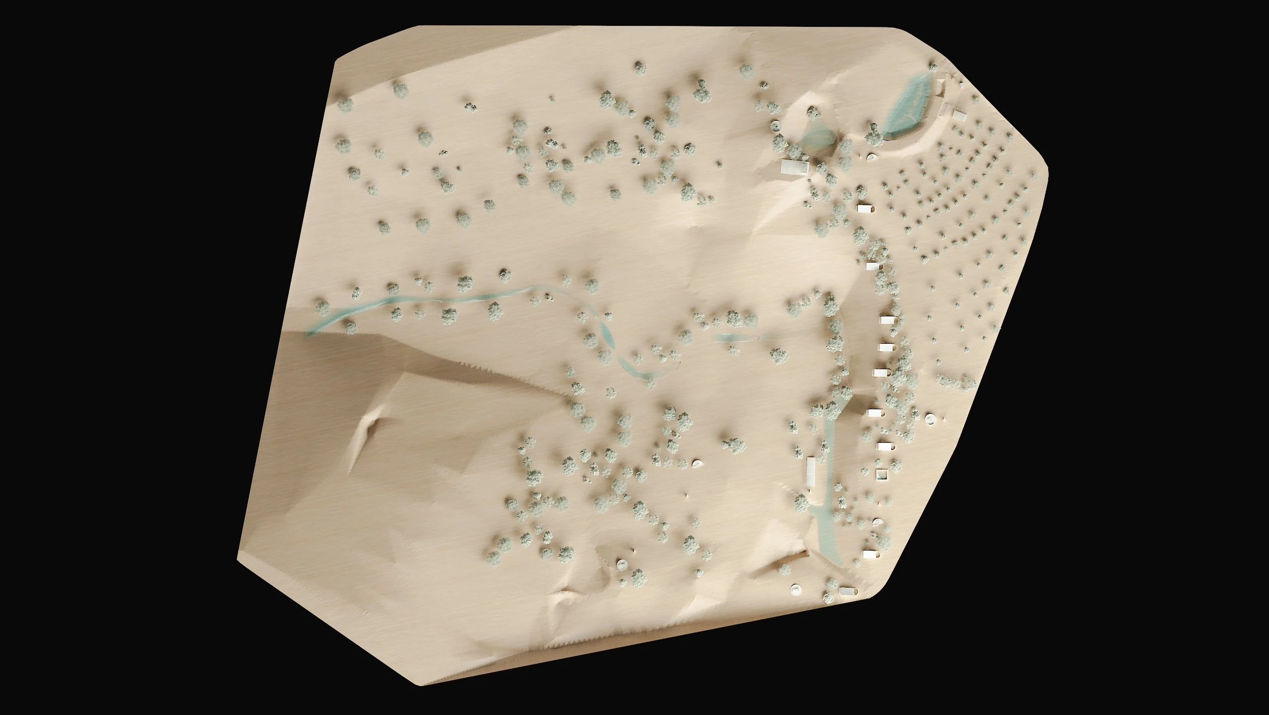 Se diseñó un Master Plan ecoturístico de baja densidad y distribución dispersa, adaptado orgánicamente a la topografía. El conjunto incluye recepción, estacionamiento, restaurante, spa, nueve cabañas y amenidades al aire libre como fogateros, alberca y un laberinto de guayabos, todo pensado para fomentar la contemplación y la privacidad.